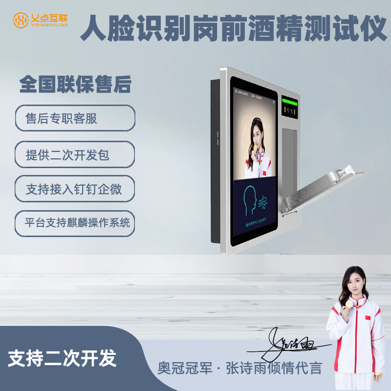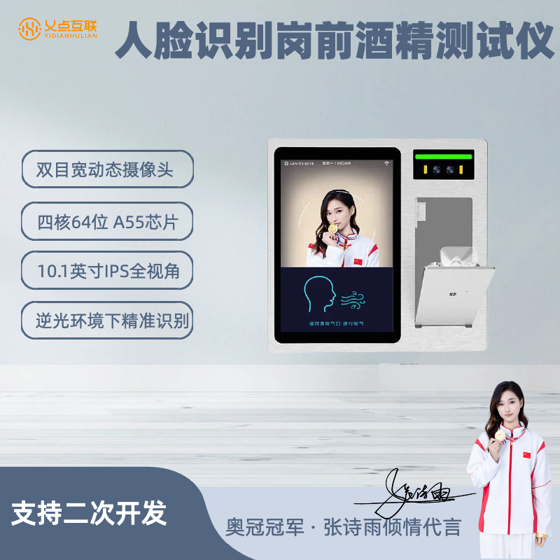 本公司 10.1 寸酒精人脸识别终端为岗前酒精检测专用设备,搭载旷视人脸识别算法,识别率99%,0.3s 极速识别,支持人脸活体检测、测温、考勤打卡与饮酒预警,有效杜绝酒后上岗,适用于各类企业岗前检测场景。